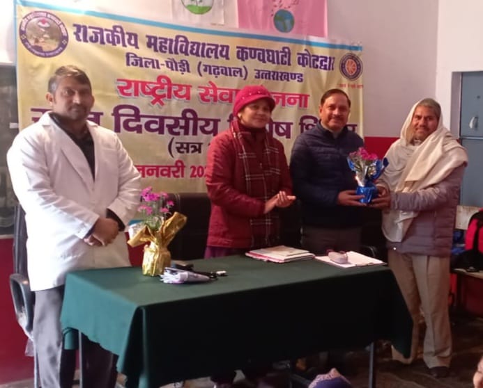 कोटद्वार के राजकीय महाविद्यालय कण्वघाटी कोटद्वार के सात दिवसीय राष्ट्रीय सेवा योजना के शिविर के दूसरे दिन स्वामी विवेकानंद जी की जयंती के अवसर पर राष्ट्रीय युवा दिवस मनाया गया ,कार्यक्रम का सुभारम्भ प्रार्थना सभा व व्यायाम के द्वारा किया गया उसके पश्चात डॉ. कपिल द्वारा योग सत्र का आयोजन किया गया जिसमे स्वयं सेवियों को अनेक योग आसन करवाए गए! स्वयं सेवियो द्वारा पर्यावरण संरक्षण शीर्षक पर एक जनजागरूकता रैली निकाली गयी जिसमे पर्यावरण बचाने के लिए अनेक नारे स्वयं सेवियों द्वारा लगाए गए! राष्ट्रीय सेवा योजना की कार्येक्रम अधिकारी डॉ. गीता रावत शाह द्वारा पर्यावरण संरक्षण हेतु एक शपथ सभी स्वयं सेवियों को दिलवाई गई कार्यक्रम के बौद्धिक सत्र में मुख्य अतिथि तथा मुख्य वक्ता डॉ. अनुराग शर्मा, असिस्टेंट प्रोफेसर वाणिज्य रहे उन्होंने स्वामी विवेकानंद जी की जयंती के अवसर पर राष्ट्रीय युवा दिवस पर अपने विचार व्यक्त किये, डॉ. शर्मा ने राष्ट्रीय युवा दिवस की ऐतिहासिक पृष्ठ्भूमि को सविस्तार बताया तथा स्वामी विवेकानंद जी के जीवन पर महत्वपूर्ण प्रकाश डाला! डॉ. अनुराग शर्मा ने युवा वर्ग को देश का आधार तथा भविष्य बताया! द्वितीय सत्र के विशिष्ट अतिथि आयुष चिकित्सक डॉ .अजय नेगी रहे उन्होंने आयुर्वेद के द्वारा शारीरिक स्वास्थय पर अपने विचार केंद्रित किये उन्होंने प्रत्येक व्यक्ति को संयमित जीवन शैली अपनाने का आग्रह किया तथा आयुर्वेद के नियमों को अपने जीवन मैं उतारने का सन्देश दिया! आज के मुख्य तथा विशिष्ट अतिथि को राष्ट्रीय सेवा योजना की मुख्य कार्येक्रम अधिकारी डॉ. गीता रावत शाह द्वारा पौधा देकर सम्मानित किया! शिविर के तृतीय सत्र में खेल गतिविधियाँ तथा सर्व धर्म प्रार्थना का भी आयोजन किया गया! द्वितीय दिवस मैं महाविद्यालय के प्राचार्य प्रो. विजय कुमार अग्रवाल, डॉ. गीता रावत शाह, डॉ.कपिल, डॉ. अनुराग शर्मा, श्री सत कुमार, श्री भारत सिंह बिष्ट श्री सुशिल पटवाल, श्री आशीष धीमान, श्री सुमन नेगी, श्री रविंद्र गुसाईं, श्रीमती रानी तथा महाविद्यालय के अनेक स्वयंसेवी उपस्थित रहे!